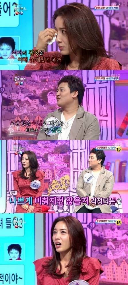 '풀하우스' 최영완이 남편에 대한 미안한 마음에 눈물을 흘렸다.지난 8일 방송된 KBS 2TV '가족의 품격-풀하우스'(이하 '풀하우스')에서는 '남자들의 자기관리'를 주제로 솔직한 토크를 나눴다.이날 최영완은 결혼 후 살이 많이 찐 손남목에게 불만을 토로하며 "남편이 부부싸움을 할 때 논리적으로 분석해서 나를 가르치려고 한다"고 남편의 태도에 서운함을 드러냈다.이에 남편 손남목은 "아내가 많이 서운했을 것 같다. 충분히 많이 느끼고 반성하겠다"고 말했고, 감동을 받은 최영완은 눈물을 보였다.최영완은 "남편이 나쁜 사람도 아니고 큰 잘못을 한 것도 아닌데 미안한 마음이 든다"며 "남편은 누구보다도 존경스럽고 멋진 남자다. 근데 너무 이런 모습들이 부각돼 나쁘게 비춰질까 봐 걱정된다"라고 털어놨다.[풀하우스 최영완, 사진=KBS2 '풀하우스' 방송 캡처]