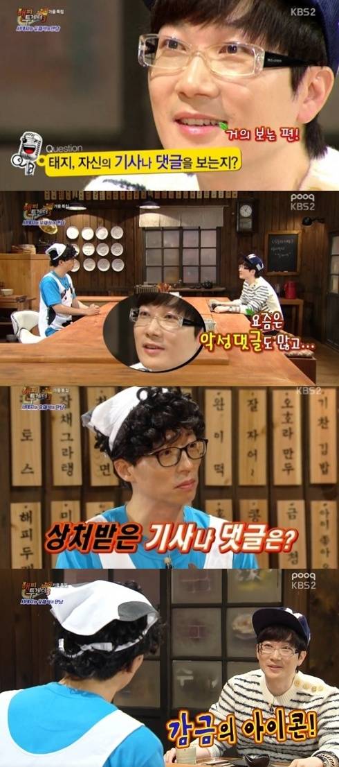 서태지가 가장 상처 받았던 악플을 언급했다.9일 방송된 KBS 2TV '해피투게더3'에는 서태지가 출연해 그 어디에서도 하지 않았던 이야기들을 솔직하게 털어놨다.이날 MC 유재석이 "기사나 댓글을 보느냐"고 묻자 서태지는 "거의 보는 편이다. 요즘은 악플도 되게 많고.. 그런데 다 좋은 것 같다. 악플이라도 관심이라고 생각한다"고 답했다.이어 유재석은 상처받은 악플에 대해 물었고, 서태지는 "감금의 아이콘"이라고 밝혔다. 서태지의 과감한 발언에 유재석은 깜짝 놀라며 "오늘 그런 얘기를 조금 있다가 속시원하게 해달라"고 말했다.[서태지 악플 언급, 사진=KBS2 '해피투게더' 방송 캡처]