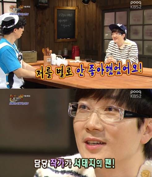서태지가 이은성이 자신의 열혈팬이었다는 사실은 오해였다고 밝혔다.서태지는 9일 방송된 KBS 2TV '해피투게더3'에 단독 게스트로 출연해 그 어디에서도 이야기하지 않았던 아내 이은성과의 첫 만남부터 결혼까지 연애 풀스토리를 털어놨다.이날 서태지는 이은성이 서태지의 팬이었다는 것에 대해 "잘못 알려진거다. 나를 별로 안 좋아했다고 하더라"고 운을 말했다.이어 "실제로 '반올림'이라는 드라마 출연 때 작가분이 내 팬이셔서 '너에게'를 계속 듣게 했다고 한다. 너무 추운데서 고아라씨랑 그 노래를 많이 들었는데, 노래가 들렸겠냐"고 덧붙였다.또한, 서태지는 "옛날 얘기에도 별 관심 없다. 일단 나이가 어리니까.. 16살 차이다"며 "내가 예전에 이런 일 있었지 그러면 아내는 '아, 뭐~' 그렇게 대답한다"고 전했다.[해피투게더 서태지 이은성, 사진=KBS2 '해피투게더' 방송 캡처]