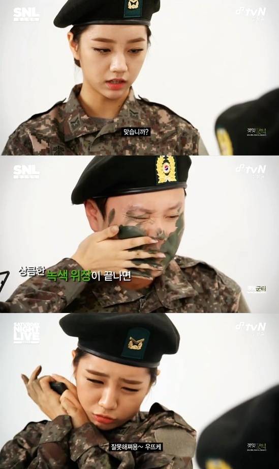 'SNL코리아' 혜리가 특급 애교로 김민교를 들었다 놨다 했다.지난 11일 방송된 tvN 'SNL 코리아 시즌5'에는 걸스데이가 호스트로 출연해 솔직한 입담과 깜찍한 발랄한 매력으로 눈길을 사로잡았다.이날 혜리는 '겟잇군티' 코너에서 군인들에게 자신만의 위장비법을 전수하며 MBC '진짜사나이' 여군특집에서 선보인 애교보다 한층 업그레이드된 애교를 부렸다.혜리는 "누구나 따라할 수 있는 위장술을 알려주겠다"며 김민교의 얼굴에 위장크림을 발라주다가 눈을 찔렀고, 김민교는 아프다고 눈물을 흘리며 짜증을 냈다.그러자 혜리는 "이잉~ 어떡해. 찔렸어요? 미안해요. 혜리가 잘못 해쪄용, 떼찌떼찌"라며 연속 애교를 선보였고, 이에 김민교는 "괜찮다"라고 말하며 환하게 웃었다.[SNL코리아 혜리, 사진=tvN 'SNL 코리아' 방송 캡처]
