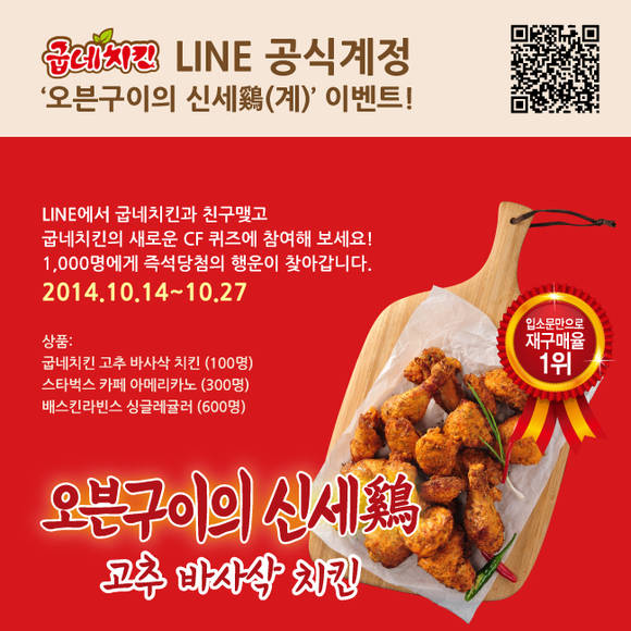 굽네치킨이 모바일 메신저 라인의 '굽네치킨' 공식 계정을 통해 '고추 바사삭 치킨' CF 영상 퀴즈 이벤트를 오는 27일까지 진행한다.라인의 '굽네치킨' 공식 계정과 친구를 맺은 고객이 이벤트 안내 메시지와 CF 영상을 전달받으면 영상을 본 후 고추 바사삭 치킨과 관련된 퀴즈를 풀면 된다.정답을 입력하면 자동으로 응모되며 즉석에서 추첨이 진행돼 결과를 바로 알 수 있다.당첨자에게는 '고추 바사삭 치킨' 모바일 쿠폰과 스타벅스 아메리카노 기프티콘, 베스킨라빈스 기프티콘 등 총 1000명에게 상품을 제공한다.'고추 바사삭 치킨'은 치킨 표면에 청양고추를 갈아 묻혀 매콤한 맛을 내며 겉은 바삭하고 속살은 촉촉한 한편, 오븐에 구워내 칼로리가 적으며, 함께 제공되는 소스 '마블링 소스'와 '고블링 소스는' 고추 바사삭 치킨을 위해 새롭게 개발되어 고추 본연의 매콤함을 살린 것이 특징이다.(주)지앤푸드 마케팅팀 이병진 팀장은 "이번 CF는 고추 바사삭 치킨이 '굽네치킨 재구매율 1위'의 메뉴이며, 청양고추가 입안 가득 퍼지는 효과를 묘사해 매콤한 특징을 잘 설명하고 있다"며 "라인에서 펼치는 이벤트에 참여해 고추 바사삭 치킨 모바일 쿠폰을 받으시길 바란다"라고 말했다.