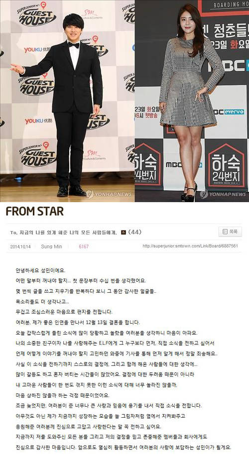 성민은 결혼과 관련해 14일 슈퍼주니어의 공식 홈페이지를 통해 "좋은 인연을 만나서 12월13일 결혼을 한다"라고 공식입장을 밝혔다.