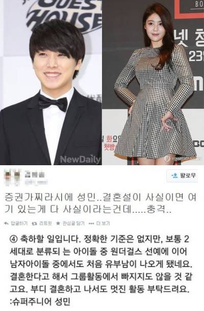 이에 성민은 결혼설과 관련해 슈퍼주니어 공식 홈페이지를 통해 "제가 좋은 인연을 만나서 12월13일 결혼을 합니다"라고 밝혔다.