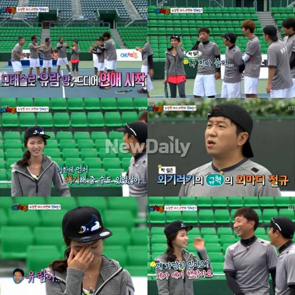차유람의 모태솔로 탈출에 '예체능' 팀이 열렬한 축하인사를 보냈다.14일 방송된 KBS 2TV '우리동네 예체능'에서는 대한민국 여자 테니스 국가대표 OB로 구성된 '마당회'와 '예체능' 테니스팀의 대결이 펼쳐졌다이날 차유람의 열애 소식에 '예체능' 멤버들은 결혼행진곡 노래를 부르며 호들갑을 떨었다. 이들은 차유람의 모태솔로를 축하하며 박수를 보냈다.하지만 정형돈은 갑자기 "우우우~"라며 이규혁을 위로했다. 이에 이규혁은 "나 진짜 슬퍼. 나한테 먼저 얘기해줄 수도 있었잖아. 이번 주에 얼마나 힘들었는지 아냐"라고 차유람에게 원망 어린 시선을 보냈다. 그동안 이규혁은 첫 만남부터 단짝으로 테니스 연습을 하며 '유람앓이'를 해왔다.그러자 정형돈은 "일요일에 술먹고 이규혁에게 전화가 왔다. 딱 한 마디 하더라. '유람아!'라고 했다. 내가 '여보세요?'하고 물었지만 전화가 바로 끊겼다"고 폭로해 웃음을 자아냈다.['예체능' 이규혁 차유람 원망, 사진=KBS2 '우리동네 예체능' 방송 캡처]