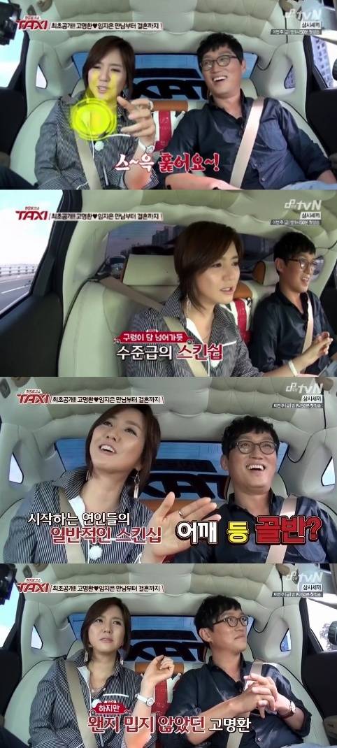 '택시' 임지은이 고명환이 스킨십 고수라는 사실을 폭로했다.14일 방송된 tvN '현장토크쇼 택시' 351회 '연애 말고 결혼' 특집 2탄에는 결혼 일주일 전 고명환 임지은 부부가 출연해 1999년 첫 만남부터 2014년 결혼하기까지의 풀 러브스토리를 공개했다.이날 고명환은 임지은과의 첫 만남에 대해 "1999년에 코미디 프로그램에서 처음 만났다. 첫날 임지은이 왔는데 정말 예뻤고 나이도 동갑이었다. 일단 친구로 지내야겠다고 생각했다"고 털어놨다.이어 임지은은 "고명환의 첫인상은 어땠si?"는 MC 오만석의 질문에 "촌스러웠다. 사투리를 누르려고 애쓰는데 그땐 사투리가 좀 심했다"고 말했다.또한, 임지은은 "고명환이 애교 있는 성격이라 스킨십을 잘했다. 당시 유행어였던 '친구야 친구야~'를 하면서도 위에서 아래까지 나를 스윽 훑어봤다"고 밝혀 웃음을 자아냈다.이어 "대부분 스킨십을 하면 어깨나 툭툭 치는데 고명환은 어깨와 등을 만지다 골반도 만지더라. 다른 남자 같았으면 징그럽고 싫었을 텐데 그게 이상하게 밉지 않고 잘 어울렸다"고 덧붙였다.[택시 임지은, 사진=tvN '현장토크쇼 택시' 방송 캡처]