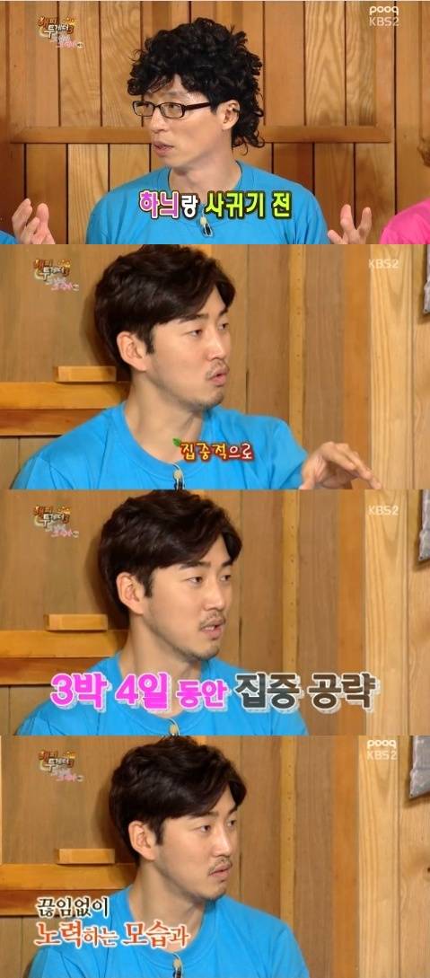 배우 윤계상이 연인 이하늬와 사귀기 전 적극 대시했다고 고백했다.16일 방송된 KBS 2TV '해피투게더3'에는 '그남자, 그여자' 특집으로 배우 윤계상, 고준희, 이미도, 박범수 감독과 연예계 대표 뮤지션 부부 조정치 정인 부부가 출연해 솔직한 입담을 펼쳤다.이날 윤계상은 "나는 좋아하는 이성이 생기면 집중적으로 다른 생각을 못하게 어필한다. 이하늬에게도 그랬다. 3박4일 동안 집중공략 했다"고 털어놨다.이에 MC들은 이하늬가 지루해하지 않냐고 물었고 윤계상은 "나에 대한 홍보를 하는 거다. 지루하지 않도록 재치있게 했다"고 자신만의 노하우를 전했다.['해피투게더' 윤계상 이하늬, 사진=KBS2 '해피투게더' 방송 캡처]