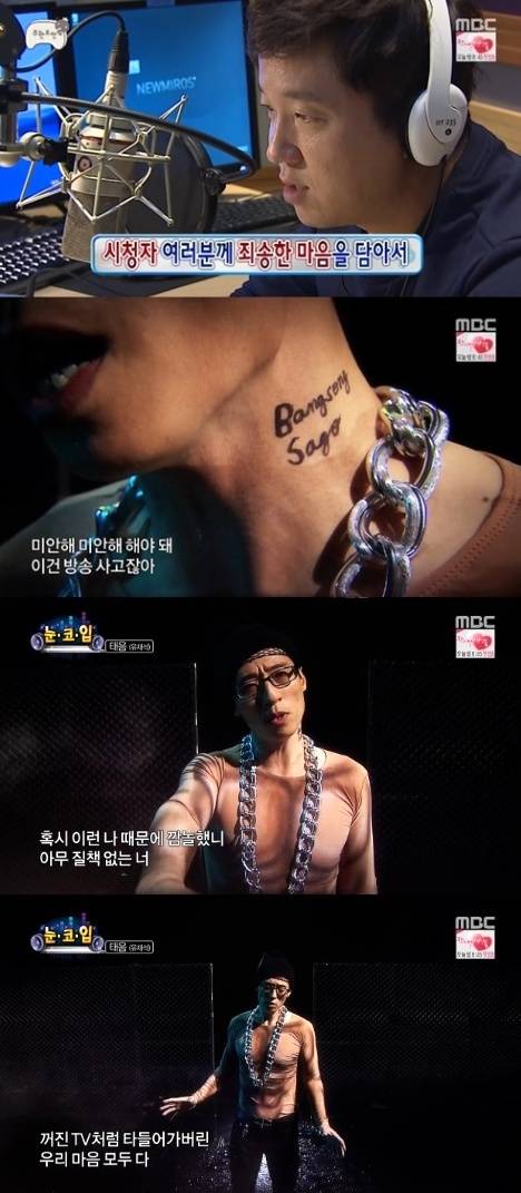 '무한도전'이 방송사고에 재치있게 사과했다.18일 방송된 MBC '무한도전' 400회 특집에서는 멤버들이 서로에 대해 더 알아가고 이해하는 데 특별한 시간이 될 '비긴 어게인(Begin Again)'이 전파를 탔다.이날 '무한도전'은 방송 말미 지난주 방송사고에 대해 뮤직비디오 형식으로 사과의 뜻을 전했다. DJ로 분한 정형돈은 "지난주 불미스러운 사고가 있었다. 시청자 여러분께 죄송한 마음을 담아서 노래 한 곡 띄어드린다"고 소개했다.영상 속 유재석은 '태음'으로 깜짝 변신해 태양의 '눈코입'을 개사해 열창했다. 유재석은 "미안해 미안해 해야돼. 이건 방송사고잖아. 정말 식겁했잖아. 정신 바짝 차려야해. 400회잖아"라고 불렀다.이어 "마지막으로 한 번만 용서해. 실수한 건 모두 다 잊어줘. 우리 정신 차릴게. 더 열심히 할게. 다시는 이런 깜짝 놀랄 일 생기지 않게. 더 좋은 방송을 향한 욕심이 집착이 돼 사고 쳤고 혹시 이런 나 때문에 깜놀했니. 아무 질책 없는 너. 바보처럼 왜. 나를 혼내지 못해. 나 큰 사고 쳤는데"라고 노랬다.또한, 유재석은 "너의 눈코입 웃어주던 네 얼굴. 작은 댓글까지 다 여전히 난 느낄 수 있지만 꺼진 TV처럼 타들어가버린 우리 마음 모두 다 너무 아프지만 이젠 더 좋은 방송 만들게"라며 '무한도전'다운 방법으로 사과해 웃음을 자아냈다.한편, 지난 11일 방송된 MBC '무한도전' 한글날 특집은 5초가량 블랙 화면과 전주 '라디오스타' 장면이 나왔고, 이어 약 3초쯤 블랙 화면과 깨진 화면이 등장하는 방송사고를 낸 바 있다.[무한도전 방송사고 사과, 사진=MBC '방송 캡처]