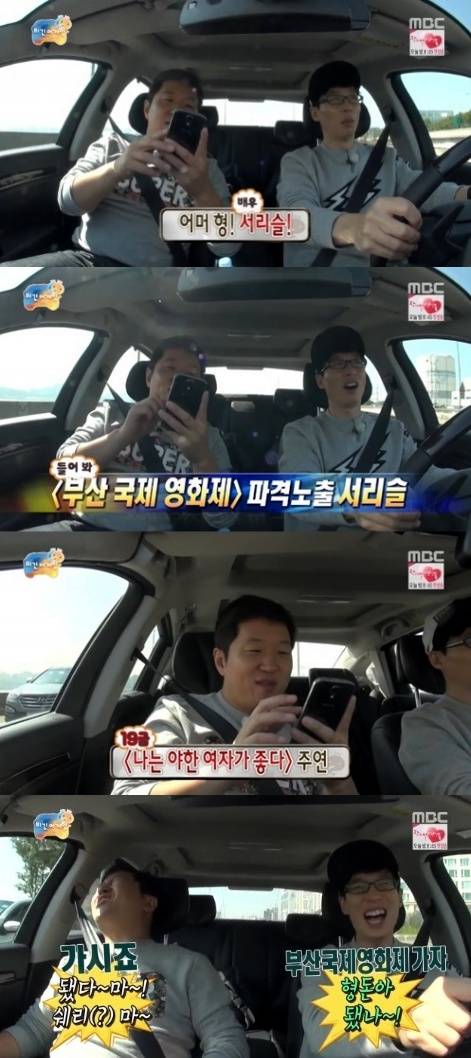 유재석 정형돈이 배우 서리슬에게 높은 관심을 보였다.지난 18일 방송된 MBC '무한도전' 400회 특집에서는 멤버들이 서로에 대해 더 알아가고 이해하기 위해 '24시간을 둘이서 함께 보내기'로 진행됐다.이날 둘만의 시간을 보내게 된 유재석과 정형돈은 24시간을 함께 보낼 여행 장소에 대해 이야기를 나누던 중 유재석이 부산행을 제안했다.이어 정형돈은 스마트폰으로 검색하더니 "부산국제영화제(BIFF)?"라고 운을 떼면서 "서리슬, 레드카펫 노출 주인공"이라고 밝혔다.이에 유재석은 "너 뭐하는 거냐"라고 정형돈을 타박했다. 하지만 정형돈이 "'나는 야한 여자가 좋다' 주연"이라고 외치자 유재석은 "형돈아 됐나? 쎄리 가자"라며 흥분된 목소리로 사심을 드러내 웃음을 자아냈다.한편, 서리슬이 출연한 영화 '나는 야한 여자가 좋다'(감독 신정균)는 20대 청춘 남녀의 뜨겁게 타오르는 격정적인 관계를 그린 파격로맨스로 지난 7월 개봉했다.[서리슬 레드카펫 파격노출, 사진=MBC '무한도전' 방송 캡처]