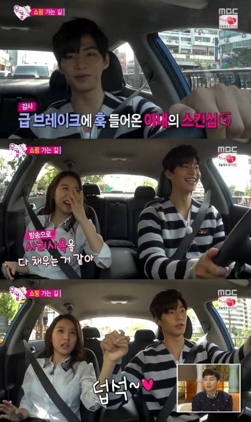 '우리결혼했어요' 송재림의 스킨십은 계속됐다.지난 18일 방송된 MBC '우리 결혼했어요 시즌4'(이하 '우결')에서는 생필품 쇼핑에 나선 송재림 김소은 커플의 모습이 그려졌다.이날 이동하는 차안에서 송재림이 갑자기 브레이크를 밟자 김소은은 송재림의 손을 잡았다. 그러자 송재림은 "급브레이크 밟으면 손을 잡아 주는구나. 앞으로 자주 밟아야겠다"고 오글거리는 멘트를 날렸다.이에 김소은은 "오빠는 방송으로 사리사욕을 다 채우은 것 같다"고 돌직구를 날렸다. 송재림은 아랑곳 하지 않고 "방송이라고 하지 말자. 너라고 하자"고 너스레를 떨며 김소은의 손을 덥석 잡았다.['우리결혼했어요' 송재림 김소은, 사진=MBC '우결' 방송 캡처]