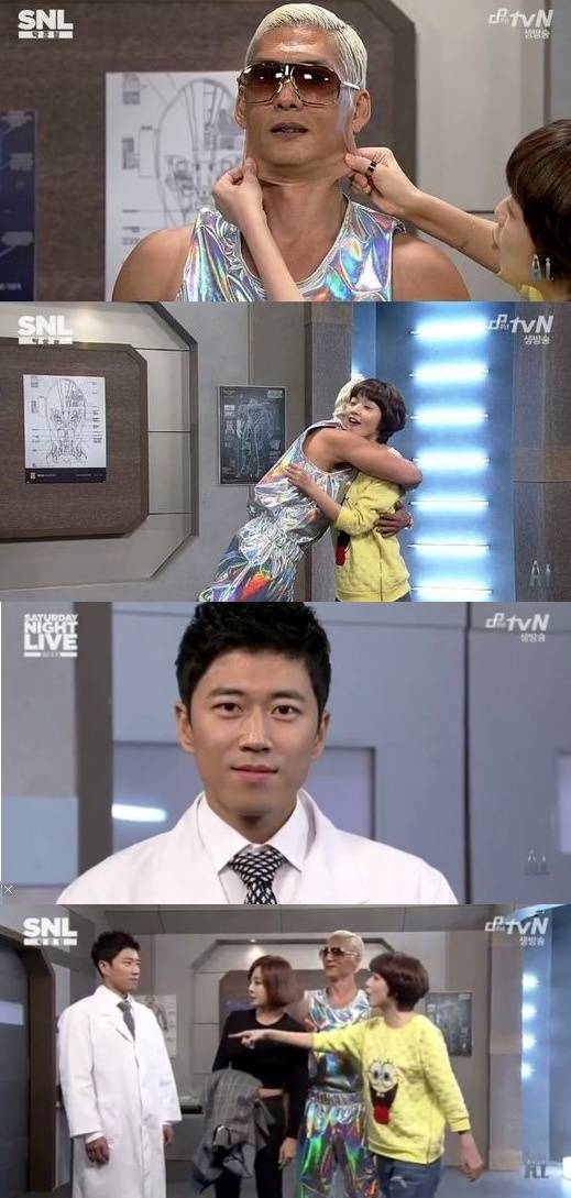 'SNL 코리아' 박준형 장수원이 냉동인간과 로봇 대결을 벌였다.박준형은 18일 방송된 tvN 'SNL코리아'에서 호스트로 등장해 인공지능 로봇으로 출연하는 'A.I', 황당 말실수 '개화기 선교사', '냉동인간 박준형의 인간극장', '배우는 배우다', '겟잇뷰티' 등을 선보였다.이날 박준형은 영화 'A.I'를 패러디한 코너에서 인공지능 로봇으로 분해 개그우먼 안영미와 진한 스킨십을 나눴다. 안영미는 박준형의 얼굴을 늘여 보이거나 뽀뽀와 포옹 등을 하며 사심을 채웠다.특히, 장수원이 박사로 등장해 어색한 말투로 국어책을 읽는 듯한 연기를 보였고, 이에 안영미는 "너도 로봇이구나"라고 말해 웃음을 자아냈다.그러자 장수원은 "무슨 소리냐. 난 로봇이 아니다. 내 말 못 들었어요? 난 로봇이 아니라 사람이다"라고 감정 없는 특유의 로봇연기를 펼쳤다.[SNL 코리아 박준형 장수원, 사진=tvN 'SNL코리아' 방송 캡처]