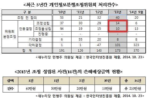 지난해 개인정보분쟁조정위원회가 처리한 사건 중 실제로 조정이 성립된 것은 불과 약 14%에 그친 것으로 나타났다.24일 국회 미래창조과학방송통신위원회 소속 민병주 위원(새누리당)이 한국인터넷진흥원으로부터 제출받은 국정감사 자료에 따르면 지난해 개인정보분쟁조정위원회가 처리한 173건 중 공식적으로 조정된 사건은 24건으로 이 중 실제로 조정이 성립된 건수는 14건에 그쳤다.특히 조정이 성립된 14건의 손해배상금액 총액은 210만원 정도였다.민 위원이 지적한 개인정보분쟁조정위원회는 개인정보 침해로 인한 분쟁발생시 비용이 많이 들고 시간이 오래 걸리는 소송제도의 대안으로 설치된 별도의 전문기구다. 개인정보 침해를 당한 국민들이 비용 없이 이용할 수 있도록 했다.하지만 분쟁조정위원회 조정안이 법적 구속력이 없어 조정결과를 당사자 어느 한 측이 수용하지 않으면 이를 강제할 수 없다는 문제가 계속해서 지적되고 있다.민 위원은 "개인정보분쟁조정위원회가 분쟁조정 건수도 적고 손해배상금액 자체도 적기 때문에 위원회 역할이 미비하고 존재감 또한 부족하다"며 "위원회 홍보를 강화하고 법률전문가를 충원하는 등 전문성을 강화해 실질적인 운영을 도모해야 한다"고 지적했다.한편, 개인정보분쟁조정위원회 위원 구성현황은 위원장 1명에 상임위원 1명을 포함한 총 20인으로 구성됐다. 사무국은 총 4명이다.지난해 3억1500만원의 예산 중 상임·비상임위원 등 인건비로 1억8000만원, 변호사 등 계약직원 인건비 9000만원 등2억7000만원을 사용했다.