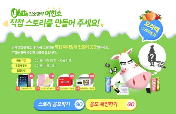 동아오츠카의 오라떼가 유튜브(youtube) 영상 '내 여자친구는 소'의 예고편을 공개하고, 이어지는 열린 결말에 대한 소비자들의 반응이 대단하다.오라떼 영상 '내 여자친구는 소'에서는 주인공 '건소형'이 여자친구의 관심을 얻기 위한 구애 장면을 그려내 웃음을 자아낸다. 이들은 사랑을 지키기 위해 농장을 벗어나 도시로 향하는데, 오라떼는 소비자들이 이후 스토리를 구성하도록 해 인기를 얻고 있다.오는 11월 7일까지 열리는 이번 이벤트는 스토리응모작 중 우수작을 선정해 1등(2명)에게는 아이패드, 2등(3명) 포켓포토2를 전달하고, 3등(10명)·4등(15명)에게 신발상품권과 문화상품권을 각각 증정한다.특히 1등으로 뽑힌 두 가지 시놉시스를 기반으로 본편영상 제작할 예정이어서 참가자들의 기대를 받고 있다. 당첨자발표는 11월 10일이다.백민희 오라떼 브랜드매니져는 "오라떼는 최근 쉽게 접할 수 있는 모바일 영상을 제작하고 소비자가 직접 참여할 수 있도록 해 로열티를 제고하면서 친숙한 브랜드 컬러를 나타내고 있다"고 전했다.