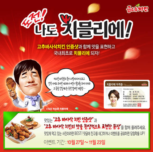 굽네치킨이 고추 바사삭 치킨을 먹고 환상적인 표현을 해주는 참여자를 선발해 '치믈리에 자격증'을 발급한다.'치믈리에' 자격증 발급은 공식 페이스북의 해당 페이지에 고추 바사삭 치킨을 먹은 인증샷과 치킨을 환상적으로 표현해주는 참여자를 선발해 발급하며, 맛있게 먹고 있는 사진이나 댓글에 친구를 태그하거나 이벤트를 공유하면 당첨확률이 높아진다.총 1110명에게 치믈리에 자격증을 발급하며, 일부 선발자에겐 굽네치킨 상품권도 제공한다.굽네치킨 홍경호 대표는 "고추 바사삭 치킨은 굽네치킨 재구매율 1위에 빛나는 만큼 고객들의 만족도가 높은 제품"이라며 "고추 바사삭 치킨을 드시고 치믈리에 행사에 참여하셔서 치킨 애호가에게만 드리는 치믈리에 자격증을 받으시길 바란다"고 말했다.한편 '치믈리에'란 와인을 관리하고 추천하는 사람인 '소믈리에'서 유래된 말로 치킨 애호가를 뜻하는 신조어이다. 최근 치킨 관련 신조어로는 '치느님', '치렐루야', '치통령'등이 있다.