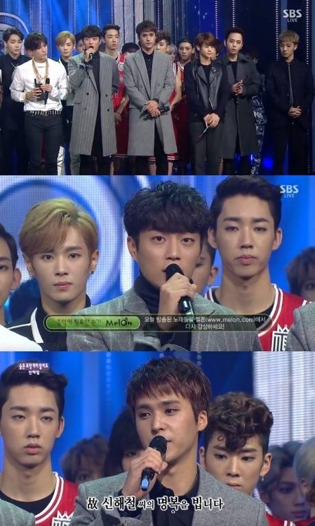 '인기가요' 비스트가 1위 수상 후 故(고) 신해철을 추모했다.비스트는 2일 방송된 SBS '인기가요'에서 '12:30'으로 에픽하이와 슈퍼주니어를 누르고 1위를 1위 트로피를 거머쥐었다. 이로써 비스트는 지상파 가요프로그램 올킬에 성공했다.이날 윤두준은 "해외 일정 때문에 감사함을 전할 기회가 없었는데, 이런 기회가 생겨서 감사하다. 고생한 스태프들, 5년간 함께 해준 뷰티(비스트 팬클럽), 부모님 정말 감사하다. 팬들에 이 상의 영광을 바친다"고 소감을 밝혔다.이어 손동운은 "이번 주 신해철 선배님이 떠나셨다. 우리도 신해철의 음악을 들으며 가수의 꿈을 키웠다. 남겨주신 음악 가슴 속에 영원히 간직하겠다"라고 전했다.'인기가요' MC들 또한 "그의 음악은 여전히 우리 마음 속에 남아있을 것이다. 삼가 고인의 명복을 빕니다"라며 故 신해철을 애도했다.[인기가요 비스트, 사진=SBS '인기가요' 방송 캡처]