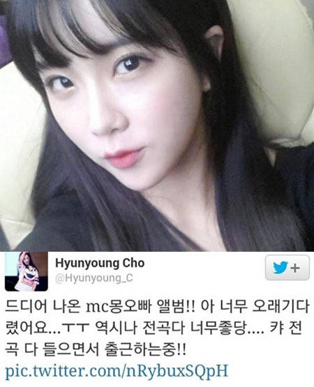 걸그룹 레인보우 조현영이 MC몽의 컴백 응원글을 남겼다가 삭제했다.조현영은 3일 자신의 트위터에 "드디어 나온 MC몽 오빠 앨범. 아 너무 오래기다렸어요. 역시나 전곡 다 너무 좋다. 전곡 다 들으면서 출근하는 중"이라는 글과 함께 노래 가사를 캡처한 사진을 게재했다.하지만 MC몽의 컴백 응원에 네티즌들의 비난 댓글이 이어지자 조현영은 트위터에 올린 해당 글을 급히 삭제 조치했다.가수 백지영 역시 이날 MC몽을 향한 응원글을 올렸다가 네티즌들의 뭇매를 맞았다. 이에 백지영은 "불쾌하셨다면 죄송합니다. 하지만 저도 동생을 위해 큰 용기를 내고 올린 것이니 넓은 마음으로 이해해 주세요"라고 해명했다.한편, 3일 자정 MC몽의 정규 6집 앨범 '미스 미 오어 디스 미(Miss me or Diss me)'의 전곡이 공개됐다. MC몽은 타이틀곡 '내가 그리웠니'를 비롯한 수록곡 전체를 음원차트에 줄을 세우는데 성공하며 놀라운 성과를 보였다.[조현영 MC몽 응원글 삭제, 사진=조현영 트위터 캡처]