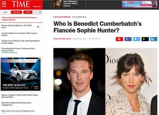 영국 드라마 '셜록'으로 유명한 배우 베네딕트 컴버배치(38)가 약혼한다.5일(현지시간) 베네딕트 컴버배치 측은 이날 발행된 영국 런던 타임지 경조사란을 통해 "완다 벤담과 티모시 컴버배치의 아들 베네딕트와 캐서린 헌터와 찰스 헌터의 딸 소피(36)가 약혼한다"고 전했다.베네딕트 컴버배치와 소피 헌터는 지난 2009년 개봉한 영화 '버레스트 페어리테일'에서 호흡을 맞추며 인연을 맺었다. 두 사람은 지난 6월 프랑스 오픈 테니스 대회를 함께 관람하는 모습이 포착되기도 했다.베네딕트의 약혼녀인 소피 헌터는 영국의 명문 옥스퍼드대를 졸업한 재원으로 영화, 연극, 연출가 등 다양한 분야에서 활동하고 있다.[베네딕트 컴버배치 약혼, 사진='타임' 홈페이지 캡처]