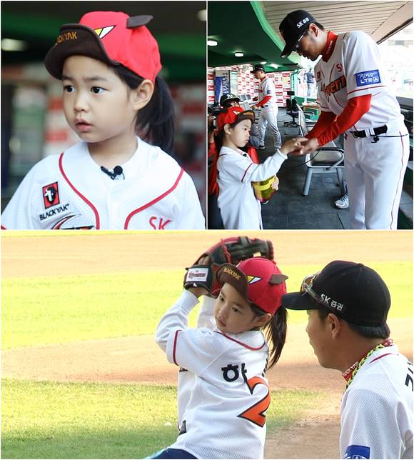 '슈퍼맨이 돌아왔다' 이하루가 이번엔 ‘야구요정’으로 변신한다.9일 방송될 KBS 2TV '해피선데이-슈퍼맨이 돌아왔다'에서는 지난달 11일 화제를 모았던 타블로-이하루 부녀의 프로야구 시구 뒷이야기가 공개될 예정이다.이날 이하루는 야구선수 삼촌들의 인기를 한 몸에 얻었다. 등에 '하루'라고 큼지막하게 적힌 유니폼을 깜찍하게 차려 입은 하루는 등장부터 선수들의 마음을 단번에 사로잡았다.하루는 선수들의 필승을 위해 미리 준비한 비타민을 선물했다. 하루는 비타민 상자를 품에 안고 "이기면 좋겠어요!"라는 응원 메시지와 함께 고사리 손으로 일일이 비타민을 나눠줬다. 긴장감이 흐르는 더그아웃에 깜짝 등장한 하루의 '요정자태'에 선수들은 "아이고 예쁘다~"를 연발하며 딸 바보의 미소를 지었다.'야구 요정' 하루에게 온 마음을 빼앗긴 선수들은 앞다퉈 하루에게 원 포인트 시구 레슨을 자청했고, 선수들의 가르침에 실력이 일취월장한 하루는 완벽한 자세로 공을 던지는데 성공했다. 이어 하루는 마운드를 내려오며 애교스러운 표정으로 "어휴~ (글러브가) 무거워서 참을 수가 없네요"라고 말해 다시 한 번 '하루 홀릭'에 빠뜨렸다.아빠 타블로와 함께 생애 첫 시구에 나선 이하루의 깜찍한 모습은 9일 오후 4시 50분 방송되는 KBS2 '슈퍼맨이 돌아왔다' 51회에서 확인할 수 있다.['슈퍼맨' 이하루 시구, 사진=KBS2 '슈퍼맨이 돌아왔다' 방송 캡처]