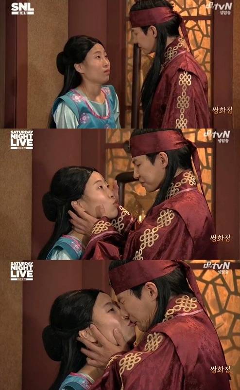 'SNL' 송재림이 생방송 도중 이세영과 입을 맞췄다.지난 8일 방송된 tvN 'SNL 코리아5' 호스트로 등장한 송재림은 영화 '쌍화점' 패러디 콩트에서 공민왕 역으로 분해 에로틱한 연기를 펼쳤다.이날 송재림은 호위무사 홍림 역의 김민교에 백허그를 하는가 하면, 입술이 닿을듯 말듯한 아슬아슬 스킨십으로 눈길을 끌었다.특히, "남색들을 즐긴다는 소문이 있다"는 중전 안영미의 말에 자신이 남색이 아니라는 것을 증명하기 위해 궁녀들을 상대로 스킨십을 했다.하지만 송재림은 김태희, 서유리에 이어 이세영 앞에서 주춤했고, 이세영은 입술을 내밀며 적극적으로 입맞춤을 유도했다. 결국 송재림은 눈을 질끈 감고 이세영에게 뽀뽀를 해 현장을 초토화 시켰다.송재림의 스킨십을 본 안영미는 "전하. 정말 안 가리시는군요"라고 말해 모두를 폭소케 했다.[SNL 송재림 이세영, 사진='SNL코리아' 방송 캡처]