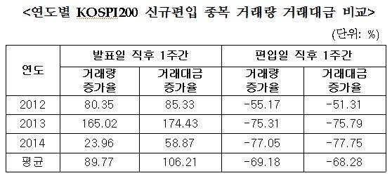 최근 3년간 코스피200 지수 신규편입 종목들의 발표일 직후 5거래일간 거래량과 거래대금은 전년 같은 기간보다 평균 89.77%, 106.21%씩 증가했다.