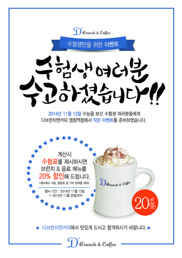 굽네치킨의 신개념 브런치 카페 'D'Brunch&Coffee(디브런치앤커피)' 염창역점에서 수험생을 격려하는 마음을 담아 브런치&음료 할인 이벤트를 펼친다.이번 이벤트는 계산 시 수험표를 제시하는 고객에게 브런치와 음료를 20% 할인해주는 것으로 오는 30일까지 진행되며 병음료 및 기타 완제품은 제외된다.DBrunch&Coffee 염창역점은 프렌치 스타일의 디저트와 음료, 천연발효 빵과 뉴욕 스타일의 샐러드와 브런치, 이탈리아 정통 파니니를 즐길 수 있는 신개념 브런치 카페로, 특급호텔 출신의 파티쉐가 매장에서 천연발효기술을 이용하여 직접 빵을 굽는다.이곳의 대표 메뉴로는, 담백한 피자에 신선한 시금치와 상큼한 그릭치즈를 얹은 '시금치 그릭 치즈 피자', 바삭한 파이 속에 베이컨과 체다치즈 그리고 반숙 계란이 들어가 고소한 맛인 '에그키쉬 브런치', 홈 메이드 요거트로 직접 만든 그리스 스타일의 치즈와 치즈치아바타가 함께 제공되는 '그릭치즈 샐러드' 등이 있다.D'Brunch&Coffee 이범철 팀장은 "시험 공부로 지쳐있는 수험생들에게 맛있는 브런치와 음료를 즐길 수 있는 기회를 제공하기 위해 이번 이벤트를 준비했다"며 "디브런치앤커피에서 맛있는 메뉴를 드시고 수험 스트레스를 푸시길 바란다"라고 말했다.