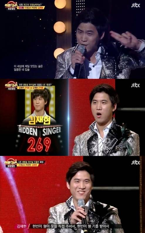 박현빈 모창능력자 김재현이 '히든싱어3' 왕중왕전에서 1위를 차지했다.15일 방송된 JTBC '히든싱어3' 왕중왕전에서는 A조 경연이 펼쳐졌다. A조에는 '모자의 기도 이선희' 김원주, '수영강사 박현빈' 김재현, '90 김태우' 김홍영, '서울대 음대 이적' 콘(KoN)이 출연했다.이날 수영강사 김재현은 박현빈의 '앗 뜨거'를 불러 총 269표를 얻으며 강력한 경쟁자 김원주를 제치고(206표) A조 1위에 올랐다.김재현은 "현빈이 형이 옷을 빌려준 덕분에 기를 받아 결승에 오른 것 같다. 정말 감사드린다"며 결승 진출 소감을 전했다.한편, '히든싱어3-왕중왕전 모창신들의 전쟁' 편에는 이선희, 이승환 등 11명의 원조가수와 함께 경연을 펼쳐 우승 혹은 준우승을 한 11명의 모창 능력자가 경연을 펼친다. 경연을 펼친 후 300명의 히든 판정단 투표를 받아 TOP3를 선정, TOP3는 생방송 파이널 결승전에 진출하게 된다.[히든싱어3 왕중왕전, 사진=JTBC '히든싱어3' 캡처]