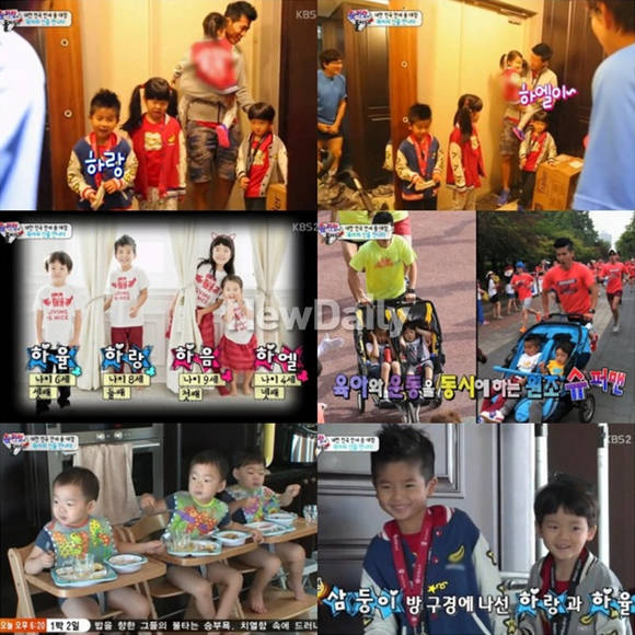 '슈퍼맨이 돌아왔다' 션 네 남매와 송일국의 삼둥이가 만났다.16일 방송된 KBS 2TV '해피선데이-슈퍼맨이 돌아왔다'에서 송일국과 삼둥이 대한-민국-만세는 가수 션과 네 남매 하음, 하랑, 하율, 하엘이와 첫 만남을 가졌다.이날 함께 션은 송일국과 마라톤 대회에 참가하기 위해 삼둥이의 집을 찾았다. 션 네 남매는 아침식사 중이던 삼둥이를 발견하고 신기한 표정을 지었다.특히, 션의 네 남매 하음, 하랑, 하율, 하엘은 아빠 션과 엄마 정혜영을 쏙 빼닮은 귀엽고 훈훈한 외모로 눈길을 사로잡았다.이어 삼둥이와 수줍게 인사를 나눈 션 사남매는 아침식사를 마친 삼둥이와 즐거운 시간을 보내며 금새 친해졌다. 무엇보다 삼둥이 둘째 민국은 누나 하음의 품에 안기며 남다른 애정을 드러내 웃음을 자아냈다.[슈퍼맨이 돌아왔다 션, 사진=SBS '슈퍼맨' 방송 캡처]