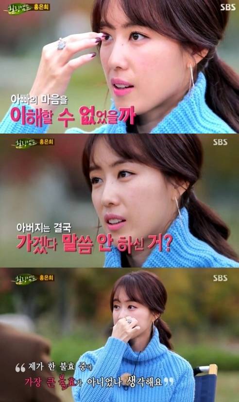 배우 홍은희가 아버지에 대한 미안함을 전했다.홍은희는 지난 17일 방송된 SBS '힐링캠프, 기쁘지 아니한가'(이하 '힐링캠프')에 출연해 그동안 방송에서 쉽게 꺼내지 못했던 가정사를 털어놓으며 가슴 아픈 눈물을 보였다.이날 홍은희는 어린 시절 부모님의 이혼을 언급하며 "아버지가 경제적인 지원을 해주지 않았다. 딸로서 무능해보였다"고 말문을 열었다.홍은희는 "내가 MBC 공채 탤런트 시험에 합격하면서 서울예대에 들어갔다. 엄마가 학비 지원이 어렵다고 해서 아버지에게 전화해서 등록금을 부탁했는데 거절 당했다. 그 일로 정말 화가 났었고 마음이 확 멀어지게 됐다"고 밝혔다.4년 후 결혼을 하게 된 홍은희는 "아버지가 살아계신데 결혼 이야기를 꺼낼 수 없었다. 미루고 미루다 결혼이 임박해서 아버지께 알렸다. '그냥 한다고요'라고 말했다"며 당시를 회상했다.이어 "누구도 오시란 말도 가겠단 말도 하지 않았다. 그때의 전화 공기가 좀 특별했다. 아버지도 가겠단 말을 차마 꺼내지 못했던 것 같다"면서 "내가 한 불효 중 가장 큰 불효다"고 전하며 눈물을 흘렸다.[홍은희 아버지, 사진=SBS '힐링캠프' 방송 캡처]