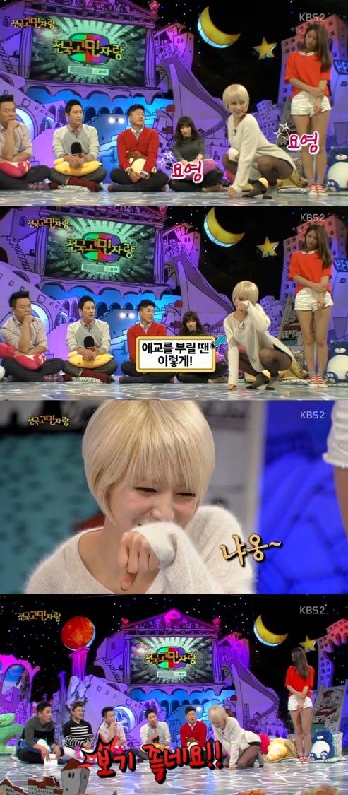 AOA 초아가 고양이 애교로 남심을 사로잡았다.지난 18일 방송된 KBS 2TV '대국민 토크쇼 안녕하세요'에는 홍록기, 정가은, AOA 초아 설현이 출연해 솔직한 입담을 나눴다.이날 초아는 "신곡 '사뿐사뿐'이 캣우먼 콘셉트다. 뮤지컬도 많이 보고 '동물농장'도 봤다"고 말해 '동물농장' MC인 신동엽을 흐뭇하게 했다.이어 고양이 포즈를 보여달라는 MC들의 요구에 초아는 무대로 나와 즉석에서 고양이를 표현했다.특히, 초아는 요염한 자태로 고양이 애교를 선보였고, 이를 본 신동엽은 "보기 좋네요"라고 솔직한 마음을 드러내 폭소를 자아냈다.[초아 고양이 애교, 사진=KBS2 '안녕하세요' 방송 캡처]