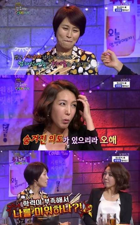 뮤지컬 배우 최정원이 과거 전수경이 자신을 미워했다고 폭로했다.지난 19일 방송된 KBS2 예능프로그램 '가족의 품격-풀하우스'의 '가족 포차' 코너에는 송승환, 최정원, 전수경, 정성화, 바다, 정원영, 시크릿 송지은이 출연했다.이날 전수경은 "지금은 베스트 프랜드다. 하지만 초창기 때 성격이 너무 달랐다. 최정원은 진짜 단순하다"고 말문을 열었다.전수경은 "연습실에서 남자 선배들한테 '오빠' 이러면 여자 선배들의 미움을 받았다. 근데 최정원은 일단 만나면 허그부터 한다. 허그 스킨십의 달인이다"고 밝혔다.또한, 전수경이 "오빠들이 다 최정원을 좋아해서 숨겨진 목적이 있을 거라 생각했다"고 고백하자 최정원은 "사실 언니(전수경) 때문에 더 열심히 한 것도 있다"고 털어놨다.이어 "난 고등학교도 졸업하지 못하고 뮤지컬을 시작했다. 언니는 좋은 대학을 나왔기 때문에 내가 학력이 부족해 날 미워하는 줄 알았다"고 덧붙였다.[전수경 최정원, 사진=KBS2 '풀하우스' 방송 캡처]