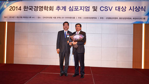 CJ그룹이 사단법인 한국경영학회가 올해 처음으로 주최한 CSV대상에서 산업통상자원부 장관상을 수상했다.CJ그룹은 지난 20일 서울 강남구 삼성동 인터컨티넨탈호텔에서 한국경영학회가 주최하고 산업통상자원부와 동반성장위원회 등이 후원한 '제1회 한국경영학회 CSV대상' 시상식에서 산업발전부문 수상의 영광을 안았다.한국경영학회측은 CJ그룹이 선도적인 CSV(Creating Shared Value; 공유가치창출) 경영 활동을 펼치며 핵심 사업과의 연계를 통해 상생 및 세계화에 공헌한 공로가 크다고 수상 이유를 밝혔다.CJ그룹은 1953년 '사업보국'의 창업이념을 바탕으로 설립된 이래, 다양한 사회공헌 활동을 통해 사회책임경영을 펼쳐왔다. 창립 60주년인 2013년 CSV경영을 본격 선언하고, 기업과 사회가 함께 성장할 수 있는 사업모델 발굴에 주력한 CJ그룹은 특히 주요 핵심 사업과 연계해 CSV를 적극 실천한 공로를 인정받았다.CJ제일제당은 '즐거운 동행'을 통해 지역의 유망 식품 중소기업과 농가에 유통과 마케팅, R&D, 품질검사 등을 지원하여 자생력을 키워주고 있으며, CJ푸드빌은 외식 브랜드 '계절밥상'을 통해 농가 소득 증대와 한식문화 대중화에 기여하고 있다.특히 해외에서 진행되는 글로벌 컨벤션인 'KCON'과 아시아 최대 음악시상식 'MAMA'를 통해 중소기업 제품을 해외에 소개하는 등 한류 세계화 및 중소기업 동반성장에 선도적 역할을 수행하고 있다. 또 CJ대한통운의 '실버택배'사업은 고용취약계층인 노년층 일자리 창출의 모범사례로 꼽히고 있다.동반성장위원회 안충영 위원장은 이날 축사를 통해 "지난 8월 미국 LA에서 열린 KCON 현장에 동반진출한 중소기업 제품에 쏟아진 뜨거운 반응이야말로 CSV의 구체적인 사례라고 할 수 있다"며 "대중소기업이 함께 협력하여 사회적 문제를 정면으로 돌파하는 동시에 수익모델 창출의 지혜를 발휘한다면 새로운 기업생태계를 구축할 수 있을 것"이라고 말했다.사단법인 한국경영학회 이장우 학회장은 "기업과 사회의 요구를 동시에 충족하는 새로운 가치의 창출, 지속가능성, 발상의 전환을 바탕으로 한 창의성이 CSV의 주요 구성 요소"라며 “CJ그룹 등 수상기업들의 CSV활동은 현재 한국 경제가 직면한 위기를 기회로 전환시키는 좋은 계기가 될 것"이라고 밝혔다.CJ주식회사 강석희 경영지원총괄 부사장은 "CJ는 앞으로도 끊임없이 사회와 소통, 협력하면서 CJ가 잘할 수 있고, 사회가 꼭 필요로 하는 것을 고민할 것"이라며 "국민과 사회로부터 사랑받는 글로벌 CSV기업이 될 수 있도록 노력하겠다"고 말했다.한편 이번 시상식에서 동반성장부문은 LG생활건강, 경영혁신부문은 KT, 창조경제부문은 한국건설생활환경시험연구원이 각각 수상했다.