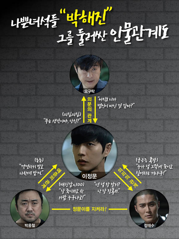 OCN '나쁜 녀석들' 속에서 모든 사건의 중심이 된 박해진과 그를 둘러싼 인물들 사이의 미묘한 관계가 공개됐다.