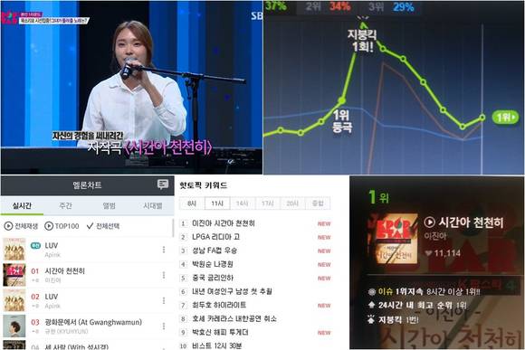뿐만 아니라 방송 직후 음원이 공개된 이진아의 자작곡 '시간아 천천히'는 각종 음원 차트 1위를 휩쓰는 기염을 토했다. 음원 사이트 멜론에서는 24일 자정, 이진아의 곡이 단숨에 1위를 기록했고, 네이버, 벅스, 소라바다 등에서도 차트 1,2위를 오가는 놀라운 기록을 달성했다.