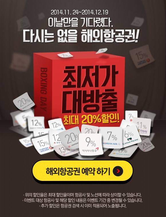 인터파크투어는 해외 여행 수요가 크게 증가하면서 해당 기획전도 선보이고 있다. 지난 24일부터 내달 19일까지 연말 박싱데이 콘셉트의 '해외항공권 최저가 대방출' 기획전을 진행한다. 해당 기간 동안 전 세계 28개 주요 항공사 별 특가 요금에 최대 20%까지 추가 할인 혜택을 제공하며, 만약 이벤트 기간 동안 더 저렴한 항공권 판매처가 있다면 차액의 300%를 'i-포인트'로 보상해 준다.