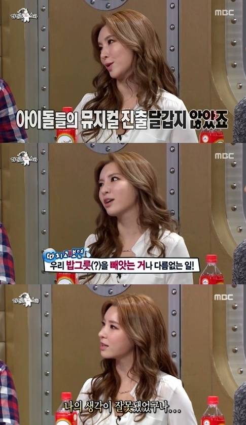 정선아가 아이돌의 뮤지컬 진출에 대한 솔직한 속내를 고백했다.지난 26일 방송된 MBC '황금어장-라디오스타'(이하 '라디오스타')에는 '타고난 딴따라' 특집으로 뮤지컬 '킹키부츠'의 오만석, 고창석, 정선아, 한선천이 출연해 솔직한 입담을 뽐냈다.이날 뮤지컬 배우 정선아는 "솔직히 초반 아이돌들이 뮤지컬 쪽으로 오는 게 싫었다. 밥그릇을 빼앗는거나 다름이 없으니까 좋지 않은 시선으로 봤다"고 밝혔다.이어 "근데 몇몇 친구들을 겪어보면서 내 생각이 너무 잘못됐구나 싶었다. 이젠 괜찮다"고 전했다.정선아의 발언에 뮤지컬 무대에 꾸준히 서고 있는 규현은 난감한 표정을 지었다. 그러자 정선아는 "규현 씨 공연은 아쉽게 아직 못 봤다"며 "계속 뮤지컬 하실거죠?"라고 질문해 웃음을 자아냈다.['라디오스타' 정선아 아이돌 언급, 사진=MBC '라디오스타' 방송 캡처]