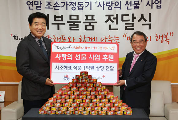 사조해표가 식품 기부에 나섰다.사조해표는 27일 오전 서울 중구 남산동 소재 대한적십자사 본사에서 취약계층 물품지원 사업 지원을 위한 기부물품 전달식을 가졌다.이날 사조해표 이인우 대표이사는 대한적십자사 김종섭 부총재 및 양사 관계자가 참석한 가운데 자사 제품인 '사조 닭가슴살 장조림캔' 1만개를 전달했다.사조해표는 이번 전달을 시작으로 5주에 걸쳐 매주 1만개씩 총 1억4천여만원 상당의 물품을 지원하며 해당 물품은 대한적십자사의 연말사업인 '사랑의 선물'을 통해 전국의 홀몸 어르신과 조손가정 등에 전달될 예정이다.이인우 대표이사는 "더불어 사는 사회를 위한 나눔 경영을 실천하기 위해 함께 나누는 ‘만캔의 행복’ 행사를 실시하게 됐다"며 "앞으로도 복지 사각지대에 놓인 다양한 계층들을 위해 지원활동을 지속적으로 발굴하고 확대해 나갈 계획"이라고 밝혔다.