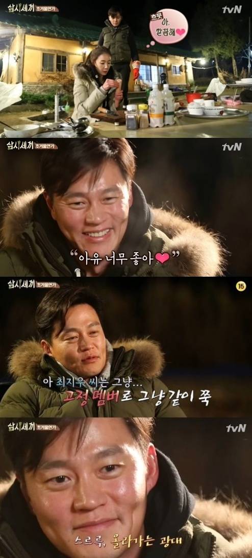 '삼시세끼' 이서진이 최지우를 칭찬하며 광대승천 미소를 지었다.지난 28일 방송된 tvN '삼시세끼'에서는 게스트 최지우와 손호준이 서로 다른 방식으로 유기농 라이프에 적응하는 모습이 그려졌다.이날 최지우는 아름다운 외모와 특유의 친근한 성격으로 눈길을 사로잡는가 하면, 요리를 할 때도 무언가를 먹을 때에도 아궁이 앞을 떠나지 않는 '아궁이 집착녀'의 모습을 보였다.특히, 이서진은 깔끔한 최지우의 모습에 크게 만족했다. 최지우는 소시지 달걀무침을 만들기 위해 필요한 요리재료와 주방 기구를 깔끔하게 정리했고, 이 모습을 본 이서진은 "아우 좋아"라며 환하게 웃었다.이후 이서진은 제작진과의 인터뷰에서 "깔끔한 사람 너무 좋다. 너무 좋다"라며 "일을 정말 잘한다. 고정 멤버가 됐으면 좋겠다"고 최지우에 대한 흡족함을 드러냈다.['삼시세끼' 이서진 최지우, 사진=tvN '삼시세끼' 방송 캡처]