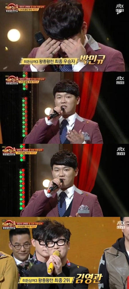 환희 모창자 박민규가 '히든싱어3' 왕중왕에 등극했다.지난 29일 방송된 JTBC '히든싱어3' 왕중왕전 파이널 무대에서는 '수영강사 박현빈' 김재현, '나이트클럽 환희' 박민규, '발전소 이승환' 김영관, 시청자가 뽑은 와일드카드 '성수동 이재훈' 임재용 등 톱4가 최후의 1인 자리를 두고 치열한 경쟁을 벌였다.이날 방송에서 김재현은 '오빠만 믿어', 임재용은 쿨 '운명', 김영관은 '그대가 그대를', 박민규는 환희 '투모로우(Tomorrow)'로 모창을 선보였다.생방송으로 진행된 '히든싱어' 왕중왕전의 모바일 총 투표수는 56만건을 넘겼고, 최종우승은 21만표를 획득한 박민규가 차지했다. 2위는 김영관, 3위는 임재용, 4위는 김재현이었다.박민규는 "형님들이 미국에서 콘서트가 있어서 혼자 외롭기도 했다. 그것보다 내가 형하고 약속한게 있었다. 진실성 있게 노래 불렀으면 좋겠다고 말씀하셔서 그 약속밖에 지킬 수 없었다"고 밝혔다. 환희는 같은날 미국에서의 공연으로 인해 아쉽게 불참했던 것.이어 환희를 향해 "해내긴 해냈다. 미국에서 보고 계시다니까 말씀드리는데 형 노래 들을 수 있게 해주셔서 정말 감사드린다. 그리고 부를 수 있게 해주셔서 감사드린다"고 전해 훈훈함을 자아냈다.한편, 오는 12월 6일 밤 11시에는 JTBC '히든싱어' 시즌 1, 2, 3 통합 왕중왕전 무대가 방송된다.[히든싱어3 왕중왕전 환희 모창자 우승, 사진=JTBC '히든싱어3' 캡처]