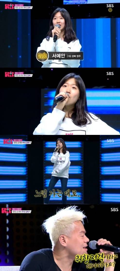 'K팝스타4' 서예안이 4차원 댄스와 깜찍한 외모로 눈길을 사로잡았다.11월 30일 방송된 SBS '일요일이 좋다-K팝스타4'(이하 'K팝스타4') 2회에서는 지난 주에 이어 참가자들의 본선 1라운드가 펼쳐졌다.이날 무대에 오른 18세 소녀 서예안은 팝스타 아리아나 그란데의 대표곡 '프라블럼'(Problem)을 경연곡으로 선택해 반전 매력을 뽐냈다.노래가 시작되자 서예안은 조용하고 수줍은 표정과 달리 시원한 고음과 느낌 가는대로 추는 어설픈 댄스로 심사위원들을 폭소케 했다.서예안의 무대를 접한 박진영은 "내가 개인적으로 이렇게 춤추는 여자를 정말 좋아한다. 완전 취향저격이다"라고 칭찬했다.유희열 역시 "우리나라 댄스 음악의 신기원을 발견한 것 같다. 내가 제작자라면 이 안무 그대로 SBS '인기가요'에 나가게 할 것 같다"며 유쾌한 심사평을 내놓았다.양현석은 "오묘하게 웃음과 매력을 줬다. 꼭 다시 보고 싶은 참가자다"라며 평했다. 결국 서예안은 세 심사위원들의 마음을 제대로 흔들며 트리플 합격을 받아 다음 라운드에 진출했다.['K팝스타4' 서예안, 사진=SBS 'K팝스타4' 방송 캡처]