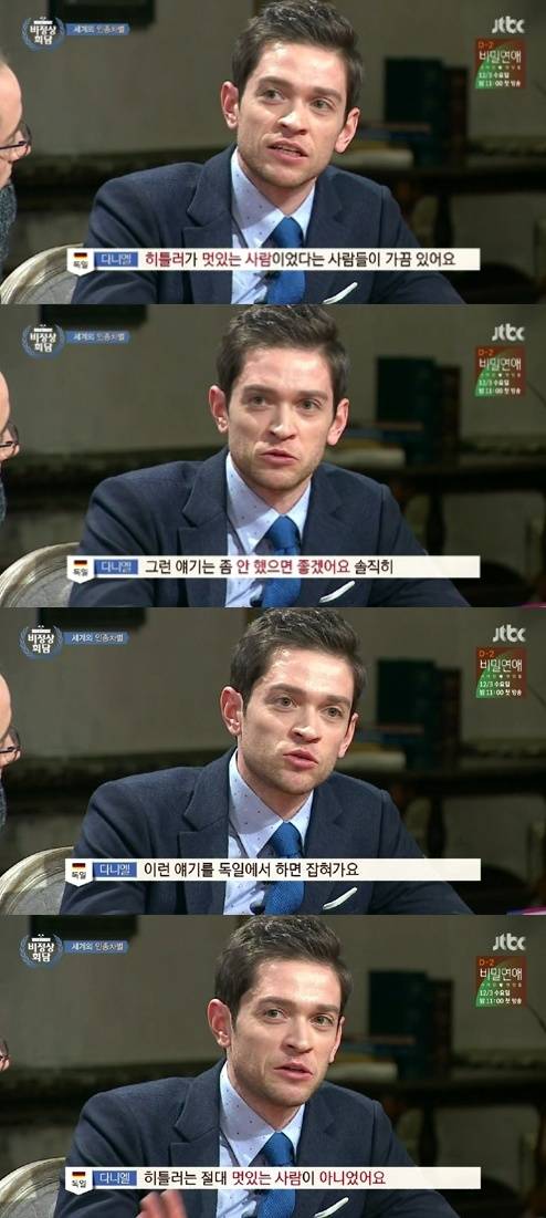 '비정상회담' 다니엘이 개념 발언으로 이목을 집중시켰다.지난 1일 방송된 JTBC '비정상회담'에서 '차별'에 대해 이야기하던 중 독일 대표 다니엘 린데만은 "잘 몰라서 그럴 것 같은데 한국에서 히틀러가 멋있는 사람이었다고 말하는 사람들이 가끔 있다"고 말문을 열었다.이어 "그런 얘기는 솔직히 좀 안 했으면 좋겠다. 저는 택시 타다가 기사 아저씨한테 그런 얘기를 들으면 독일 사람으로서 내리고 싶다. 이런 이야기를 독일에서 하면 잡혀간다"고 밝혔다.또한, 다니엘은 "히틀러는 절대 멋있는 사람이 아니었다"며 "어떤 면에서도 좋게 보면 안 된다. 정말 악마였다"고 독일의 독재자 히틀러 찬양의 왜곡된 시선을 비판했다.[비정상회담 다니엘 소신발언, 사진=JTBC '비정상회담' 방송 캡처]중화권 소식 刘德华380万获邀跨年演唱 “锋菲”拒同台