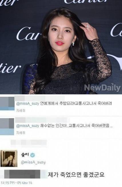 앞서 A씨는 지난 11월 트위터를 통해 수지에게 "재수없는 인간아, 교통사고 나서 죽어버렸라", "연예계에서 추방되라"등의 악성댓글을 남겼다.