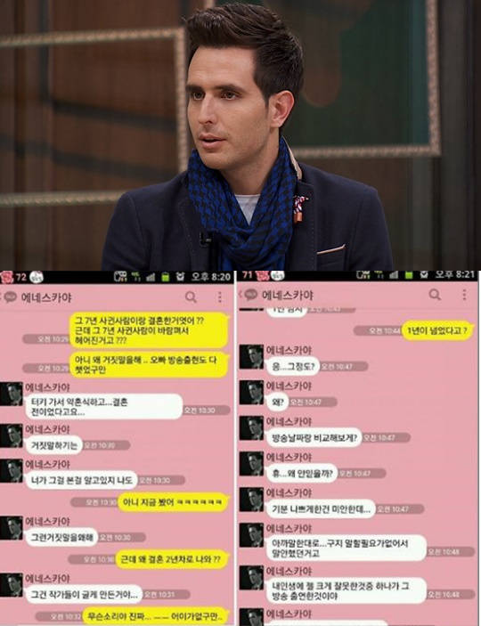 터키 출신 방송인 에네스 카야가 불륜설에 휩싸인 가운데 또 다른 추가 피해여성이 등장했다.지난달 30일 한 온라인 커뮤니티에는 '에네스 더이상 총각행세 하지 마라'라는 글과 함께 카카오톡 대화 내용 일부를 캡처해 올렸다.글쓴이는 "에네스 너 나한테 사과해라. 너의 부인한테도 사과하고. 너 앞으로 그렇게 살지 마"라며 "나처럼 속아서 농락당하거나 더한 것도 당할지도 모르는 여자들이 생기지 않았으면 한다"고 유부남인 에네스 카야가 총각 행세를 했다고 주장했다.해당 글이 일파만파로 퍼지며 논란이 되자 또 다른 피해자 여성이 나타났다. 이 여성이 공개한 카톡 메시지에서 결혼했냐고 에네스 카야를 추궁하자 그는 "약혼했었다", "(결혼 2년 차라는 것은) 작가들이 그렇게 만든 거다", "내 인생에 제일 잘못한 것 중 하나가 방송 출연이다" 등의 변명을 했다.카카오톡 내용의 진위 여부가 확인되지 않고 있는 가운데, 에네스 카야 측은 별다른 입장을 내놓지 않고 있어 의혹만 더욱 키우고 있다.[에네스 카야 불륜 논란, JTBC/ 온라인 커뮤니티]