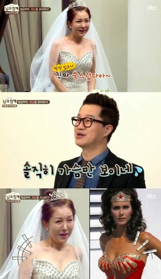 지상렬이 박준금의 웨딩드레스 자태에 노골적인 발언을 던졌다.지난 2일 방송된 JTBC '님과 함께'에서 웨딩투어에 나선 지상렬과 박준금은 함께 웨딩드레스 숍과 쥬얼리 숍을 방문하며 실제 결혼준비에 들어간 것처럼 들뜬 기분을 즐겼다.이날 웨딩드레스를 입고 등장한 박준금의 모습에 지상렬은 "솔직히 애기하면 지금 가슴만 보인다"며 "좋긴 좋은데 상반신이 너무 반짝이니깐 원더우먼 같다"고 밝혔다.또한, 지상렬은 다른 디자인의 웨딩드레스를 추천하며 "난 이 스타일이 좋다. 신부가 살아야 하는데 지금 디자인은 가슴 부분밖에 안 보인다"고 말해 웃음을 자아냈다.[박준금 웨딩드레스 자태, 사진=JTBC '님과 함께' 방송 캡처]