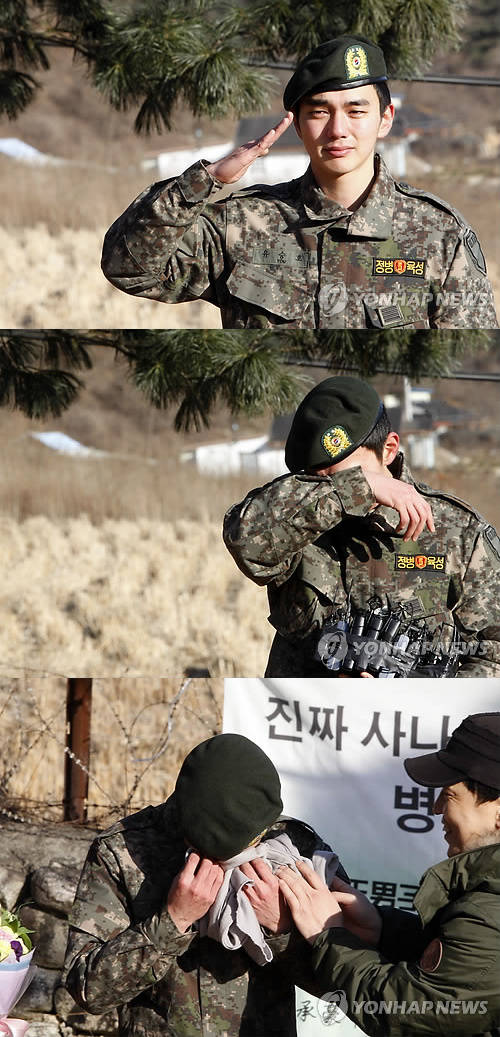 만기 전역한 배우 유승호가 폭풍 눈물을 흘렸다.유승호는 4일 오전 9시 30분 경 강원도 화천군에 위치한 27사단 이기자 부대 신병교육대대에서 전역식을 치렀다. 이날 유승호 전역식에는 수많은 취재진은 물론 한국, 중국, 일본 등에서 모인 70여 명의 팬들이 참석했다.유승호는 취재진과 팬들을 향해 늠름한 모습으로 거수 경례를 하며 전역 신고를 했다. 특히, 그는 전역 직후 하염없이 눈물을 흘려 보는 이들을 뭉클하게 만들었다.유승호는 "카메라를 보니까 진짜 반갑다. 안 울려고 했지만 후임 조교와 간부를 만나니 눈물이 났다"고 말하며 눈물을 쏟았다. 이어 "팬 여러분들 기다려 주셔서 정말 감사하다"며 "앞으로 더 좋은 작품으로 인사드리겠다"고 전했다.한편, 유승호는 지난 2013년 3월 5일 비밀리에 강원도 춘천 102보충대를 통해 입소했다. 5주간의 입소훈련을 마친 유승호는 27사단 수색대대로 자대 배치를 받고 조교로 보직 변경돼 신병교육대대에서 조교로 군복무 했다.['전역' 유승호 눈물, 사진=연합뉴스]