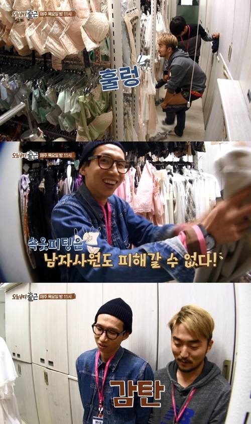 '오늘부터 출근' 제작진은 "드라마 '미생'에서 장백기와 강대리가 함께 목욕탕에 간 뒤 서로 훨씬 편한 사이가 되었던 장면의 현실 버전이다. 속옷회사에서 함께 탈의실 체험을 한 뒤 한층 더 의기투합하게 되는 세 남자의 모습을 볼 수 있을 것"이라고 설명했다.