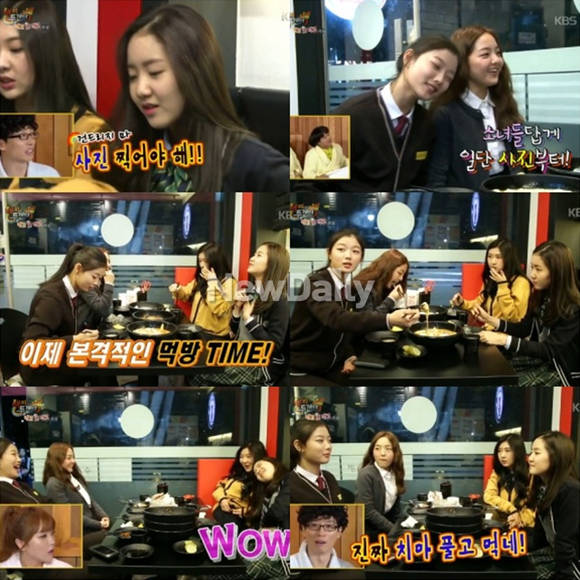 아역배우 4인방 김유정, 서신애, 이영유, 진지희의 먹방이 공개됐다.4일 방송된 KBS 2TV '해피투게더3'는 '먹고 또 먹고' 특집으로 연예계 먹방스타 김유정, 김태우, 김준현, 홍진영, 미쓰에이 페이가 출연해 솔직한 입담을 선보였다.이날 김유정은 서신애, 이영유, 진지희 함께 분식점을 찾았다. 이들은 분식점에 들어가자마자 까르보나라와 떡볶이, 주먹밥, 닭발 등을 주문하고 폭풍 흡입하기 시작했다.특히, 김유정은 간장에 떡볶이를 찍어 먹었고, 이를 본 서신애 이영유 진지희는 김유정을 향해 "화성인이다"라고 외치며 놀라움을 드러냈다. "대체 무슨 맛이야?"라고 말하던 진지희는 직접 맛을 보고는 "생각보다 맛있다"라고 감탄했다.이후 아역 4인방은 후식으로 나온 빙수를 먹기 위해 치마 지퍼를 풀어 웃음을 자아냈다. 김유정은 "다이어트 때문에 3~4일 동안 못 먹었는데 언니랑 친구 핑계로 먹어서 정말 좋다"며 해맑은 미소를 지었다.[김유정 서신애 이영유 진지희 먹방, 사진=KBS2 '해피투게더' 캡처]