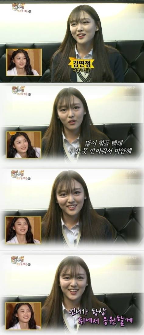아역배우 김유정의 친언니가 공개됐다.4일 방송된 KBS 2TV '해피투게더3'는 '먹고 또 먹고' 특집으로 연예계 먹방스타 김유정, 김태우, 김준현, 홍진영, 미쓰에이 페이가 출연해 솔직한 입담을 선보였다.이날 김유정 친언니 김연정 양은 동생을 식탐을 폭로하며 응원의 메시지를 전했다. 특히, 영상 속 김연정 양은 동생 못지않은 인형외모로 우월한 유전자를 입증했다.김유정 언니는 "동생이 식탐이 되게 많은데 요즘 다이어트 때문에 학교에서 급식을 못먹고 오이를 싸갖고 다닌다. 안쓰럽다"고 털어놨다.이어 "요새 많이 힘들텐데 투정 못받아줘서 미안하다. 힘든 일 있으면 얘기하고 꼭 좋은 배우가 됐으면 좋겠다. 언니가 항상 뒤에서 응원할게""라고 말해 훈훈함을 자아냈다.[김유정 친언니 공개, 사진=KBS2 '해피투게더' 방송 캡처]