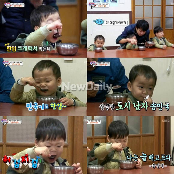 '슈퍼맨이 돌아왔다' 삼둥이가 팥죽 먹방으로 남다른 식욕을 자랑했다.지난 7일 방송된 KBS 2TV '해피선데이-슈퍼맨이 돌아왔다'에서 송일국은 삼둥이 대한 민국 만세와 함께 시골체험에 나서는 모습이 그려졌다.이날 송일국과 삼둥이는 저녁 시간에 나온 팥죽을 맛있게 먹기 시작했다. 장남 대한이는 뜨거운 팥죽을 호호 불어가며 한입 크게 떠서 먹었다.둘째 민국이는 한입 먹을 때마다 입에 묻은 팥죽을 휴지로 닦는 깔끔한 도시남자의 면모를 드러내 웃음을 자아냈다.자유로운 영혼 만세는 팥죽을 허겁지겁 먹으며 금새 한 그릇을 뚝딱 해치웠고, 아주머니에게 더 달라며 슬그머니 그릇을 내밀어 눈길을 끌었다.['슈퍼맨이 돌아왔다' 삼둥이 팥죽 먹방, 사진=KBS2 '슈퍼맨' 방송 캡처]