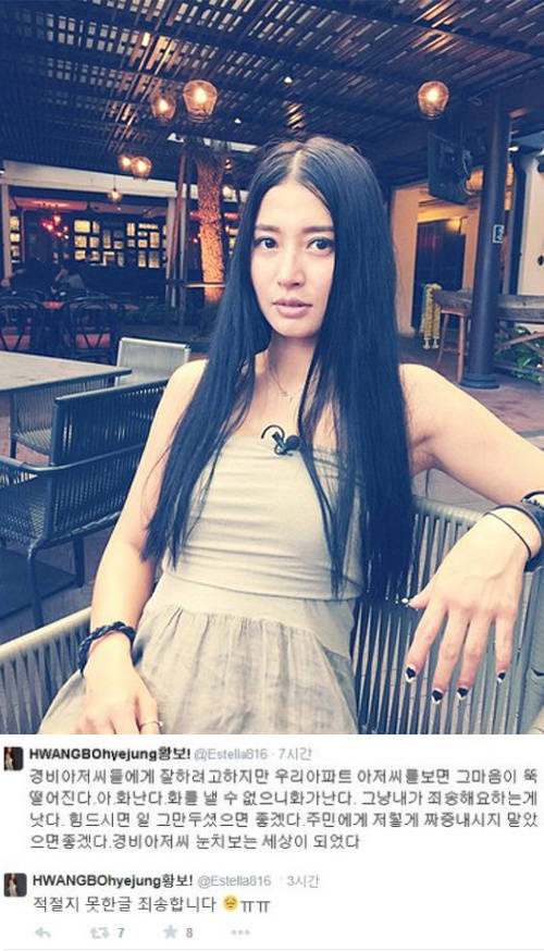 황보가 경비원 불평글을 올렸다가 바로 사과했다.황보는 지난 10일 자신의 트위터에 경비 아저씨들에게 잘하려고 하지만, 우리 아파트 아저씨를 보면 그 마음이 뚝 떨어진다"라는 글을 게재했다.이어 "화난다. 화를 낼 수 없으니 화가 난다. 그냥 '내가 죄송해요'하는 게 낫다. 힘드시면 일 그만두셨으면 좋겠다. 주민에게 저렇게 짜증내시지 말았으면 좋겠다. 경비 아저씨 눈치보는 세상이 되었다"며 불만을 토로했다.하지만 황보의 SNS 글은 최근 사회적 이슈로 주목받고 있는 경비원 분신사건과 맞물려 네티즌들 사이에 논란이 됐다. 이에 황보는 11일 해당 글을 삭제하고 "적절치 못한 글 죄송합니다"라고 사과의 글을 남겼다.한편, 황보는 현재 KBS 1TV '리얼체험 세상을 품다'에 출연 중이다.[황보 경비원 불만글 논란, 사진=황보 인스타그램 및 트위터 캡처]