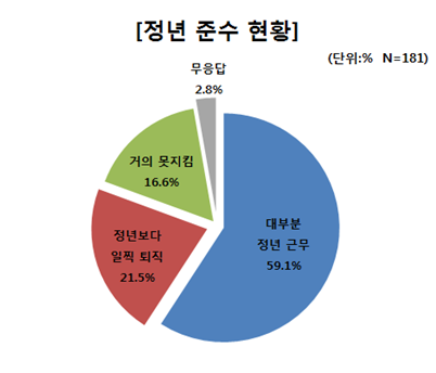 그러나 대부분의 근로자가 정년까지 근무하는 기업은 59.1%에 불과했다. 명예퇴직 등으로 규정된 정년보다 일찍 퇴직하는 기업이 21.5%, 정년을 거의 채우지 못하는 기업 16.6%, 무응답 2.8%였다.정년까지 근무하는 비중이 가장 높은 직군(중복응답)은 생산·생산관리(49.6%)였으며 경영관리(18.7%), 영업·마케팅(13.8%), R&D(연구개발·10.6%)가 그 뒤를 이었다.
