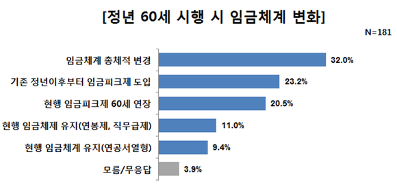 전국경제인연합회는 여론조사기관 리서치앤리서치에 의뢰해 매출액 상위 500대 기업 중 종업원 300인 이상인 기업을 대상으로 지난달 11일부터 5일까지 실시한 '정년 60세와 노동시장 변화' 조사 결과를 16일 발표했다. 조사 응답 기업은 181개사다.
